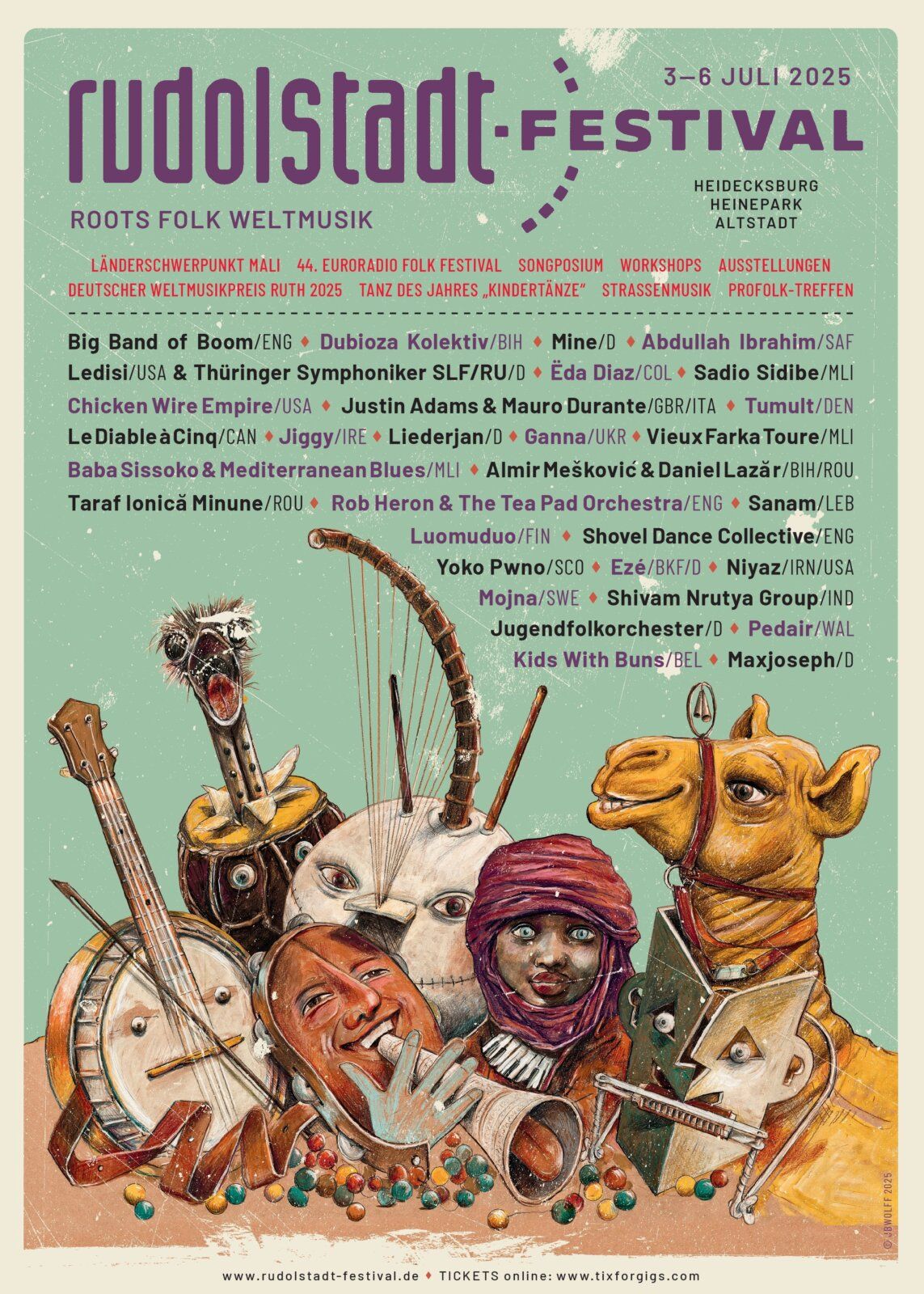 Deutschlands größtes Event seiner Art wird auch in diesem Jahr wieder Zehntausende Menschen anziehen, um Künstlerinnen und Künstler zu hören wie den neunzigjährigen südafrikanischen Pianisten und Komponisten Abdullah Ibrahim, dessen Musik zum Soundtrack des Widerstands gegen die Apartheid wurde und Nelson Mandelas Freiheitskampf begleitete. Oder die Kultband Che Sudaka, das 2002 von einstmals illegalen Immigranten in Barcelona gegründete heutige Flaggschiff der Mestizomusik mit einem einmaligen Soundxix aus lateinamerikanischer Folklore, Ska, Reggae und Punk. Deutschlands dienstälteste Folkband Liederjan wird auf und mit dem Festival nicht nur ihr fünfzigjähriges Jubiläum, sondern auch den Abschied von der Bühne zum Ende des Jahres feiern.