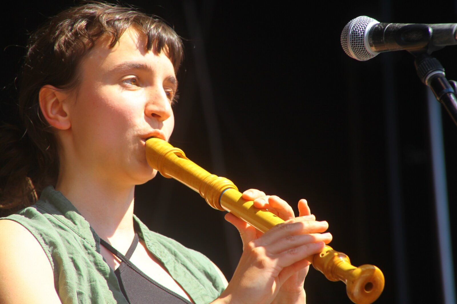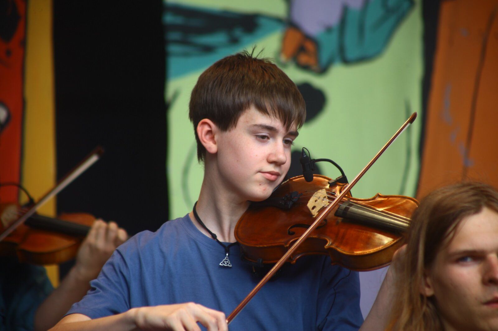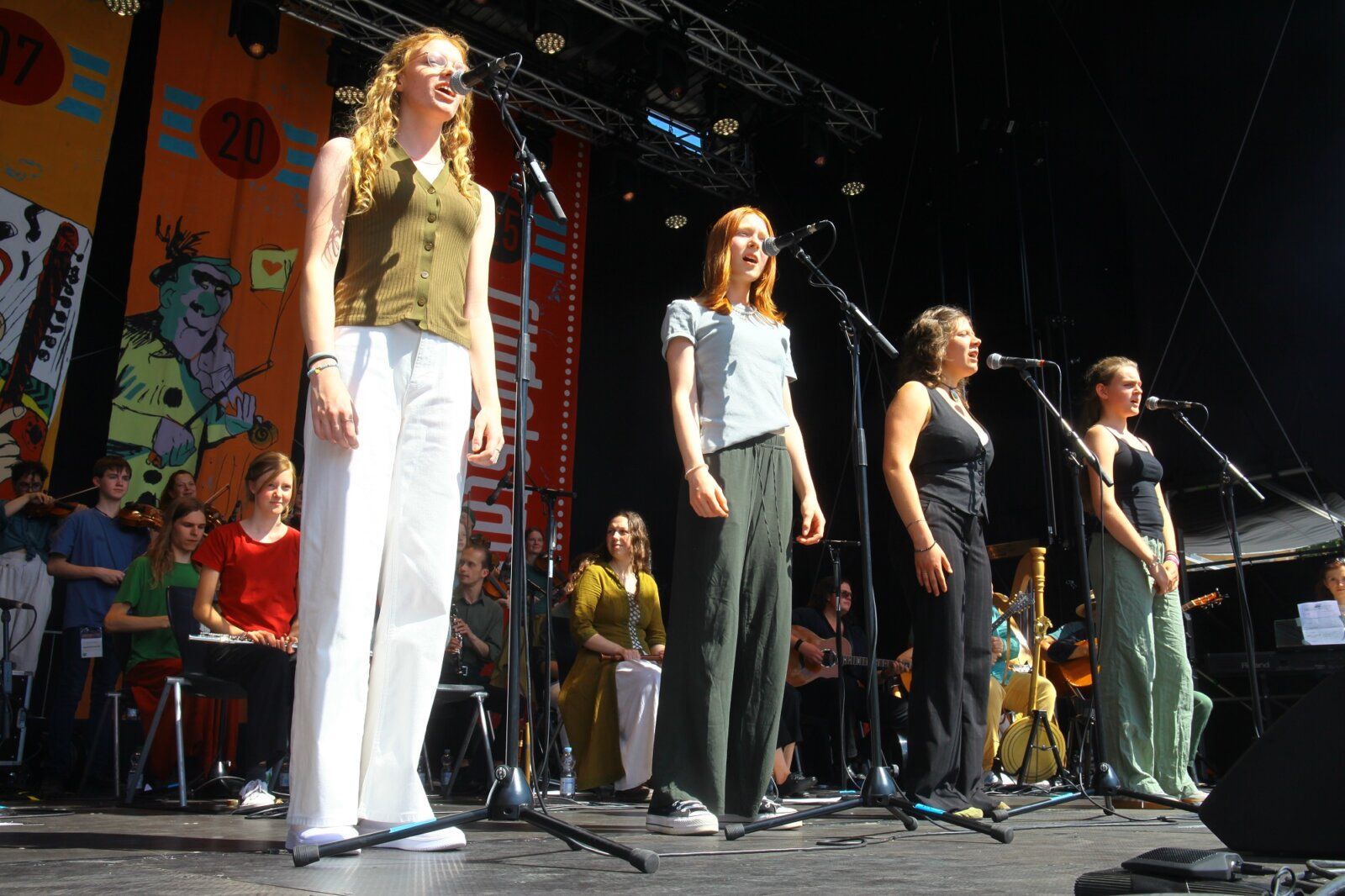 Vierzig Jugendliche zwischen 12 und 27 Jahren mit Geigen, Gitarren, Akkordeons, Sackpfeifen, Drehleier, Klarinetten, Flöten, Oboe, Harfen, Mandoline, Banjo, Klavier, Bodhrán und anderen Instrumenten sowie ihren Stimmen auf der Bühne, ohne Notenblätter, ohne Dirigent, spielen und singen traditionelle deutsche Stücke und Lieder. Was für ein Bild! Was für ein Klang! Nach der erfolgreichen ersten Auflage des Jugendfolkorchesters 2024, einer Initiative unter dem Dach des Verbands Profolk, folgte nun die zweite, wieder mit zwei Konzerten auf dem Rudolstadt-Festival, am Samstag auf der Marktbühne, am Sonntag auf der Heidecksburg. Dazwischen stand Ideengeberin und Hauptorganisatorin Gudrun Walther folker-Herausgeber Mike Kamp beim Talk im Schminkkasten Rede und Antwort.