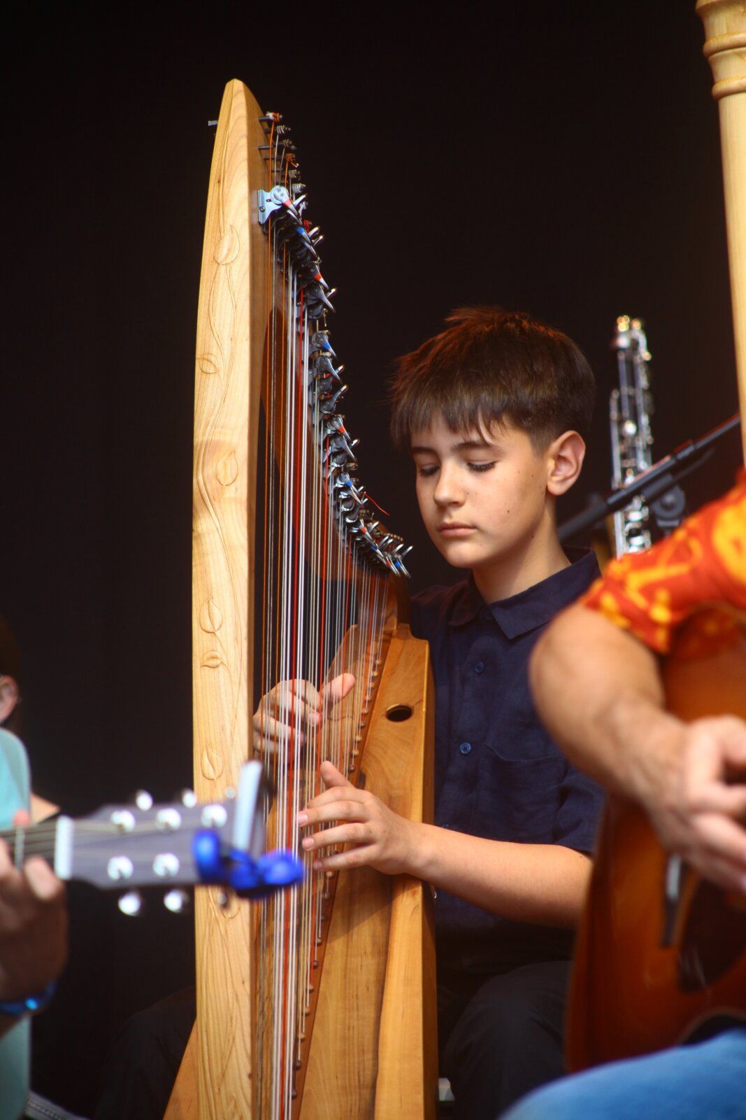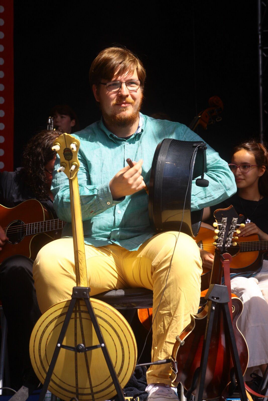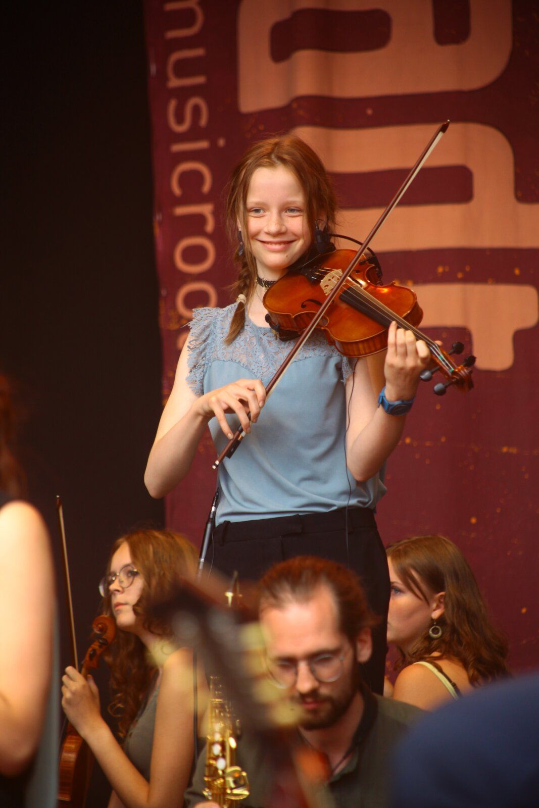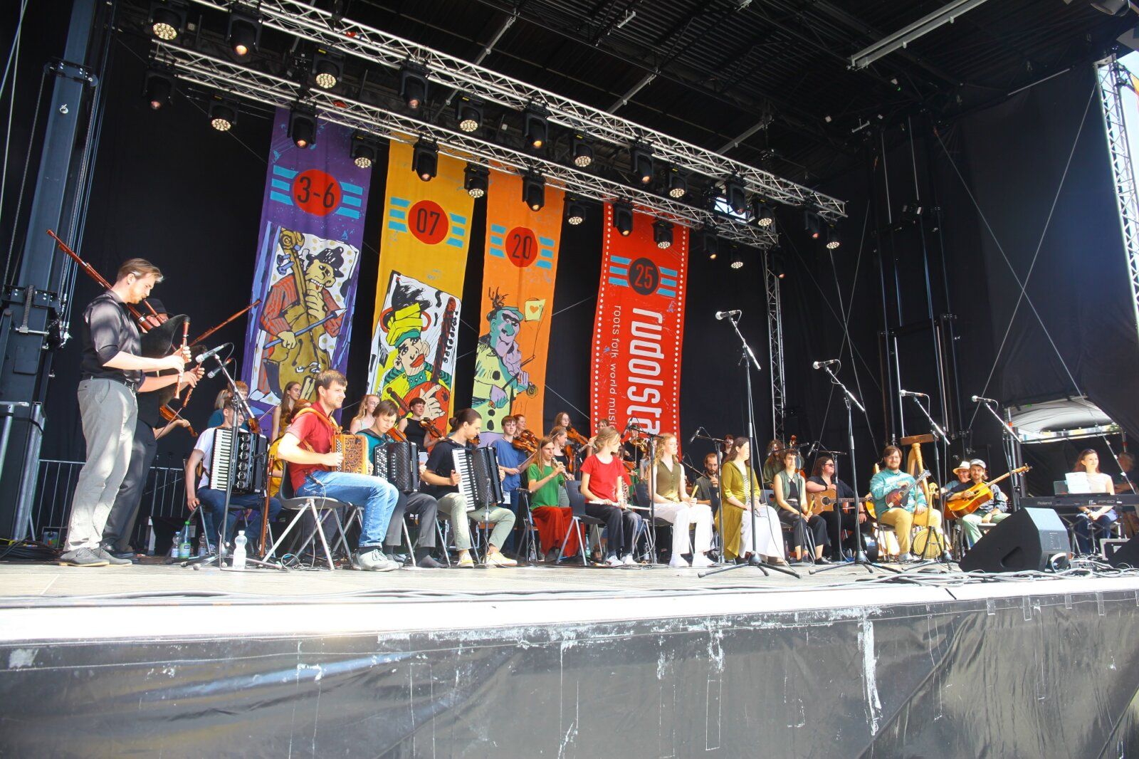 Vierzig Jugendliche zwischen 12 und 27 Jahren mit Geigen, Gitarren, Akkordeons, Sackpfeifen, Drehleier, Klarinetten, Flöten, Oboe, Harfen, Mandoline, Banjo, Klavier, Bodhrán und anderen Instrumenten sowie ihren Stimmen auf der Bühne, ohne Notenblätter, ohne Dirigent, spielen und singen traditionelle deutsche Stücke und Lieder. Was für ein Bild! Was für ein Klang! Nach der erfolgreichen ersten Auflage des Jugendfolkorchesters 2024, einer Initiative unter dem Dach des Verbands Profolk, folgte nun die zweite, wieder mit zwei Konzerten auf dem Rudolstadt-Festival, am Samstag auf der Marktbühne, am Sonntag auf der Heidecksburg. Dazwischen stand Ideengeberin und Hauptorganisatorin Gudrun Walther folker-Herausgeber Mike Kamp beim Talk im Schminkkasten Rede und Antwort.