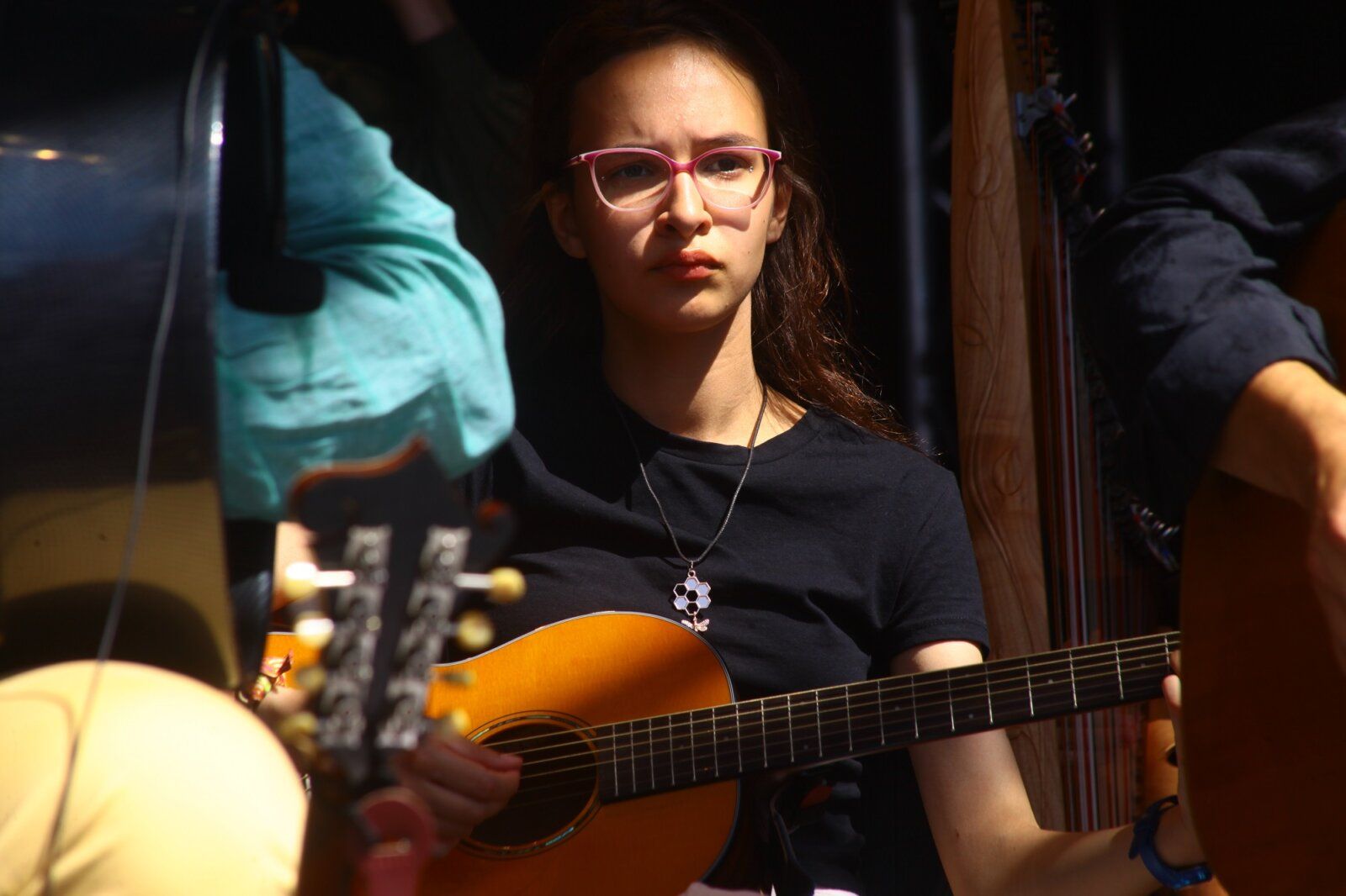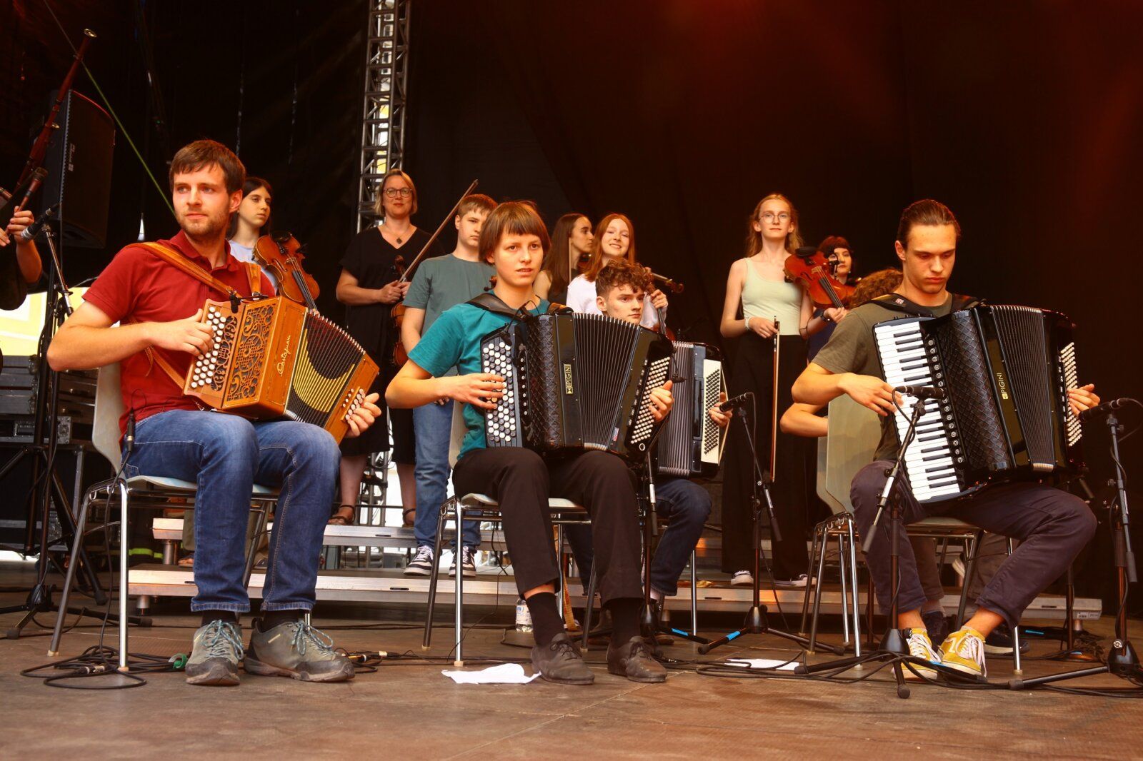 Das Repertoire des JFO entstammt einer Longlist, die Walther und Treyz zusammengestellt haben. Dazu beigetragen haben viele Aktive aus der Szene wie Christoph Pelgen, Björn Kaidel, Vivien Zeller oder Matthias Branschke. In diesem Jahr konnten auch die Teilnehmenden Vorschläge einreichen. Abhängig von den zur Verfügung stehenden Instrumenten und damit verbundenen Tonartmöglichkeiten wird dann konkret ausgesucht. „Bei den Liedtexten“, erklärt Walther, „legen wir Wert auf Themen, die für Jugendliche auch heute noch relevant sind. Es darf auch eine politische Message geben.“ So kam in diesem Jahr das „Bürgerlied“ von Albert Harnisch von 1845 in der Version Florian Kirners alias Prinz Chaos II. mit dem Titel „Zusammen“ zur Aufführung – gefunden hatte Walther die dem Sinn des Ursprungsliedes entsprechend aktualisierte Fassung auf der von Wolfgang Leyn betriebenen Website www.ostfolk.de. Politik im engeren Sinn ist zwar nicht Inhalt oder Anliegen des JFO, aber das Einnehmen einer gesellschaftspolitischen Haltung gehört für Gudrun Walther gerade in der augenblicklichen Situation dazu. „Das Jugendfolkorchester versteht sich als Botschafter für eine buntere, diversere Kulturlandschaft, für mehr Akzeptanz und Respekt, Miteinander statt Gegeneinander, Horizonterweiterung statt Schubladendenken, Demokratie statt Hierarchie. Wir glauben deshalb, dass das JFO in unseren turbulenten Zeiten ein Leuchtturmprojekt in Sachen Demokratiebildung durch Kultur ist – ein Projekt, bei dem sich die jungen Menschen wirklich gesehen fühlen, in welchem sie lernen, Eigenverantwortung in einer Gruppe zu tragen und zu einem Ganzen zusammenzuwachsen, das größer ist als die Summe seiner Teile.“