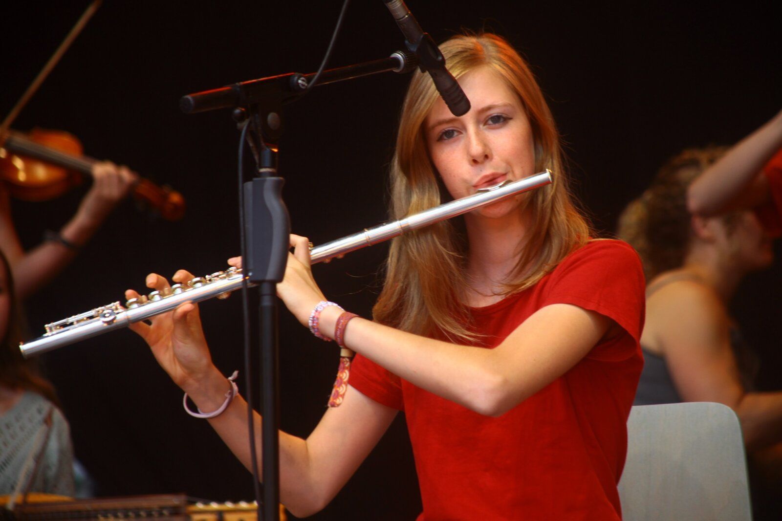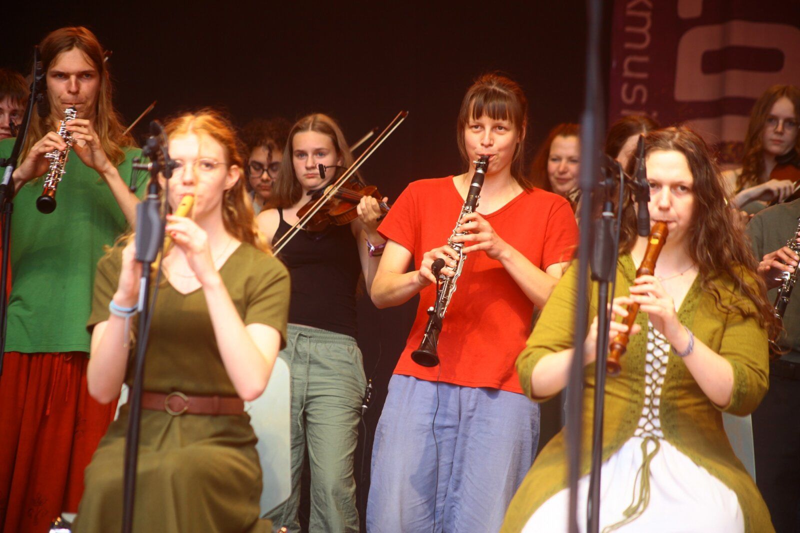 Auch englische Literatur hat einen Einfluss, wenn auch eher auf die angewandte Pädagogik als auf die Musik. Wie im Zauberinternat Hogwarts aus Joanne K. Rowlings Harry Potter-Reihe gibt es beim JFO sogenannte Häuser, die hier nach Notensammlungen benannt sind. Jedes Ensemblemitglied gehört einem dieser Häuser an und kann Plus- oder Minuspunkte für das Haus sammeln – Letztere zum Beispiel im Fall der Jüngeren, wenn man abends nach 22.00 Uhr nicht im eigenen Zimmer ist. Pluspunkte bekommen wiederum die Älteren, die bereits im ersten Jahr die Tradition des Gute-Nacht-Lieder-Singens etabliert haben, um den jüngeren Orchestermitgliedern das Einschlafen zu versüßen. Gudrun Walther erzählt diese Sequenz mit einem Lächeln und erklärt: „Wir sind ein Orchester ohne Noten, ohne Dirigent, mit flacher Hierarchie und sozialer Ausrichtung – alles Dinge, die für mich zum neuen ‚Deutschfolk‘ dazugehören. Es ist schön, zu sehen, wie respektvoll die älteren Teilnehmenden den jüngeren begegnen – jede Person im JFO ist Musiker*in, egal in welcher Altersgruppe, und das wissen alle. Bei uns lernen die Mitwirkenden auch das Zuhören, sowohl musikalisch als auch menschlich.“