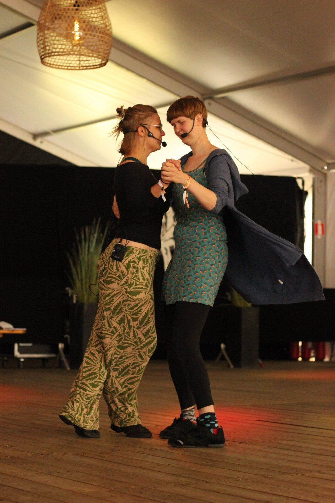Line und Mara entsprachen tanzend und im Leben von Anfang an nicht dem heteronormativen Bild. „Das wurde oft als defizitär betrachtet und kommentiert mit ‚Habt ihr keinen Mann gefunden?‘ oder ‚Ach ja, gibt zu wenig Männer hier, ne?‘.“ Beim Tanzen in den früher klassischen Rollen fiel ihnen auf, dass insbesondere ältere Männer oft nicht sehr einfühlsam tanzten und nicht bemerkten, wenn ihre Tanzpartnerinnen verunsichert waren und eigentlich etwas anderes brauchten. In ihren Workshops – auch ergänzt durch Methoden aus Lines Tanztherapie-Werkzeugkoffer – gibt es zwischen den Tanzeinheiten daher Raum für Austausch: Wie ging es mir mit diesem Tanz? Was hat sich gut angefühlt? Wo bin ich an meine Grenzen gekommen oder sogar darübergegangen?