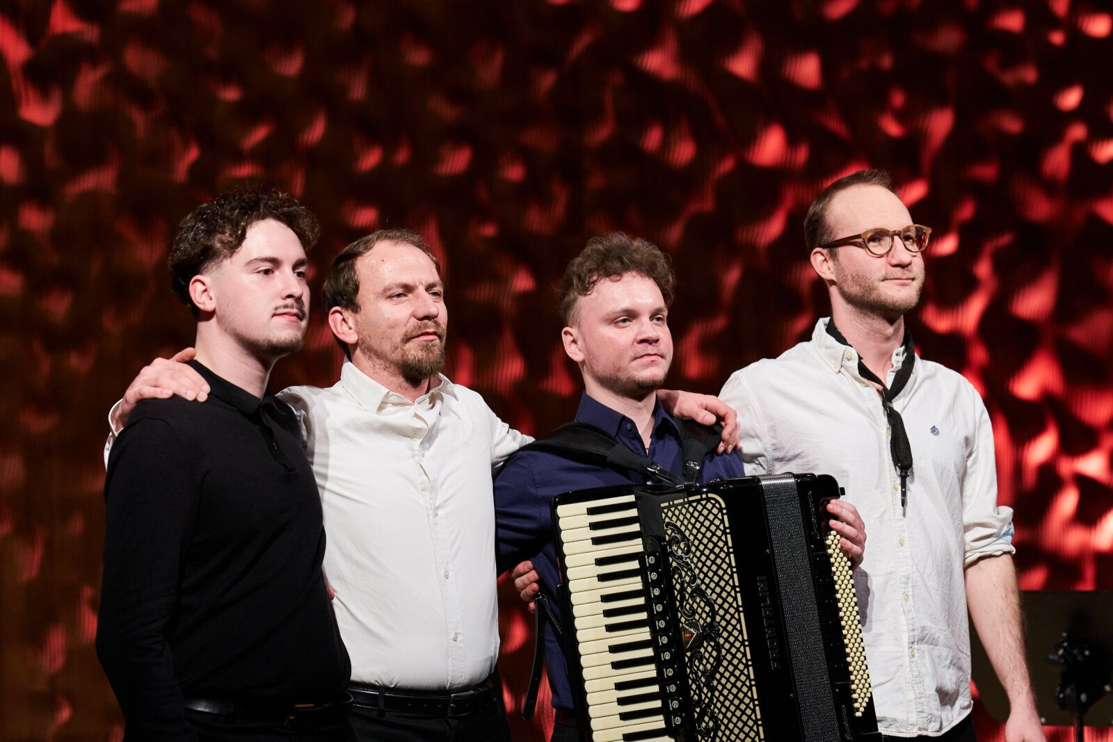 Auf den Tanzboden entführt dann der zweite Teil des Konzerts, und auch der beginnt mit einer Komposition aus Ungarn. Begleitet jetzt von Kontrabass, Akkordeon und Klarinette, erklingt ein „Bulgarischer Rhythmus“, eine souveräne Bearbeitung Horváths von Balkanrhythmen, in der er auf Vorlagen aus Bartoks Mikrokosmos zurückgreift. Ein flirrendes Spiel mit Volksmusiktraditionen, die das Quartett mit frappierender Geschwindigkeit und dichtem Miteinander vorträgt. Zsombor Herédi am Akkordeon und Áron Horváth mit seiner vierbeinigen Wunderkammer werfen sich in der Folge mit offenkundiger Begeisterung immer neue Ideen und Herausforderungen zu.
