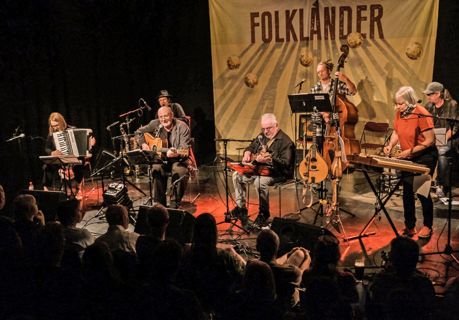 Folkländer und Gäste – vorn v. l. n. r. Dietmar „Alphorn“ Schultz (mand), Heidi Eichenberg (acc, voc), Jürgen B. Wolff (g, voc), Manfred Wagenbreth (bouz, voc), Gabi Lattke, (hackbrett), Erik Kross (hackbrett); hinten: Elke Barbera/Astrid Schulze (backvoc), Dirk Wasmund (cl), Andreas Uhlmann (tb), Jindra Lattke (dble-b, voc), Peter „Schottenschulle“ Schulze (pipes), Thomas Hauf (perc), Jörg Wolf (cel)