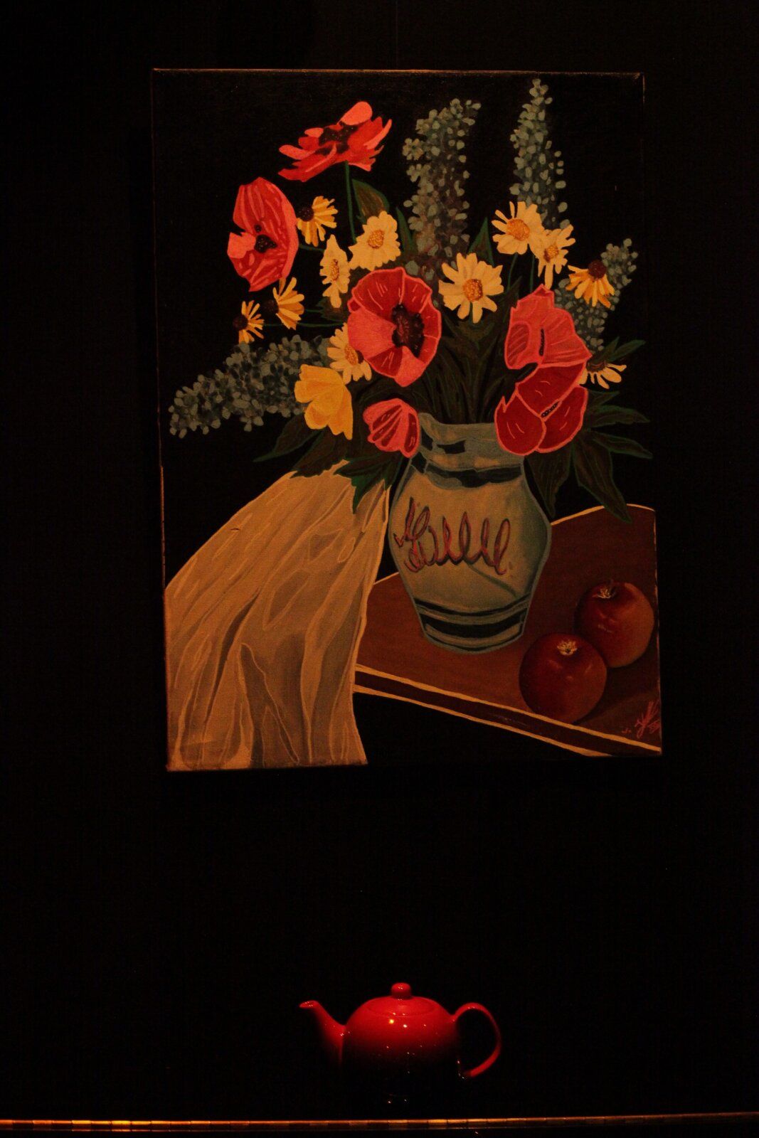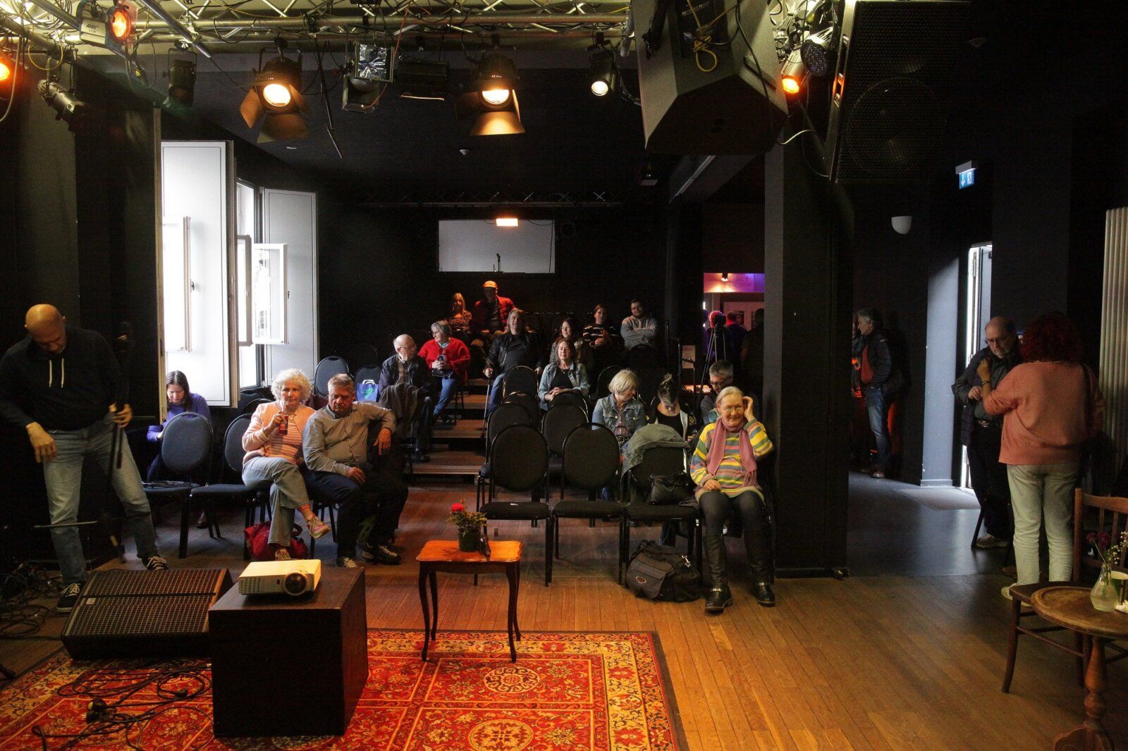 Mit Bistrotischen, einem Klavier, einer kleinen Theke sowie einer Ausstellung des Saarbrücker Künstlers Jens Stoevesand und einer Teekanne aus dem Wohnzimmer des Festivalleiters Manuel Sattler war der Saal sehr geschmackvoll und persönlich dekoriert.