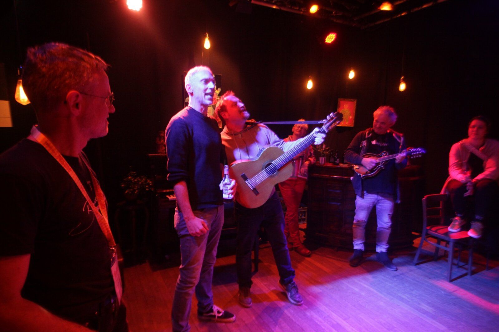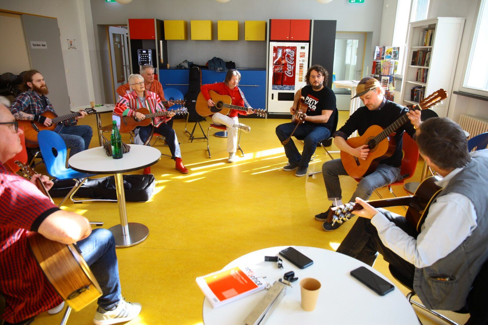 Ein ebenfalls zweiteiliger Workshop mit dem Titel „Das Travispicking – Die Kunst des Fingerpickings“ war ein Angebot für Gitarristinnen und Gitarristen. Michael Schäfer aus Saarbrücken (im Foto rechts, mit Mütze) brachte den Teilnehmenden einige für sie neue Griffe bei. Es ging auf dem Festival also nicht nur um Mundart, sondern zum Beispiel auch um Liedbegleitung.