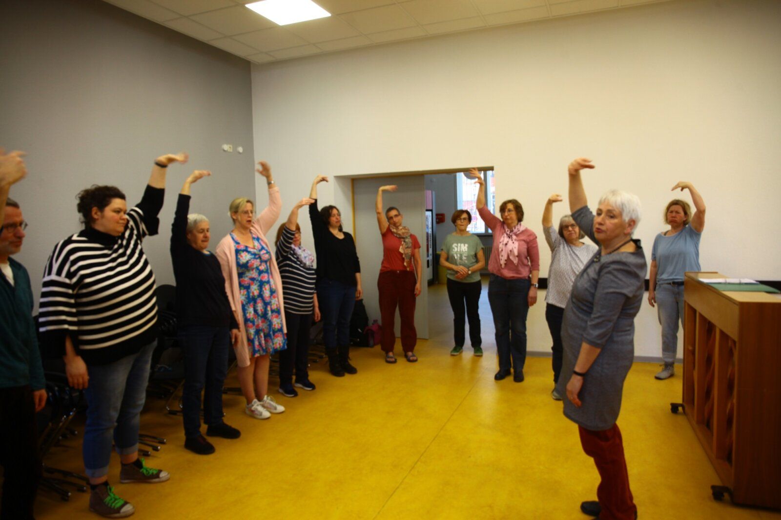 An beiden Morgen gab es einen Chorworkshop unter dem Titel „Sing mit uns! Einstimmig, mehrstimmig, vielstimmig!“, der jeweils mit einer Auflockerungsübung startete. Chorleiterin Amei Scheib aus Saarbrücken führte im Verbund mit Karla „Feli“ Feles und Elena Seeger die Teilnehmenden von den ersten Tönen bis zu einer vierstimmigen Performance von Liedern der beiden Liedermacherinnen auf Hamburger Platt und Schwäbisch. Beide waren sehr ergriffen, ihre Lieder aus so vielen Kehlen zu hören.