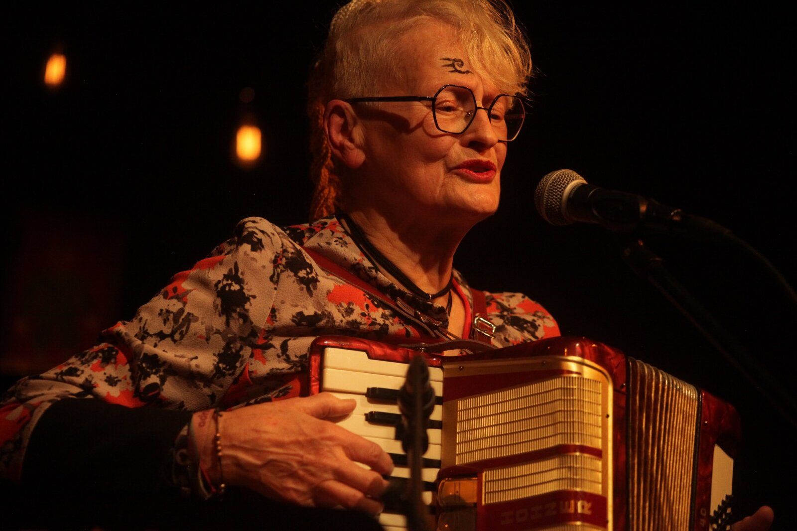 „Ich bin 47 …“, stellte sich Feli dem Publikum vor. Um zu ergänzen: „… geboren.“ Die Wahlhamburgerin, gebürtig aus Waldbröl im Bergischen Land, eröffnete das Samstagabendprogramm. Mit Akkordeon oder Gitarre sang sie ihre zumeist platt-, manchmal standarddeutschen Lieder wie „Dor geit dat Hart op“ („Da geht das Herz auf“), „Op de Alster schwimmt Qualster“ („Auf der Alster schwimmt Schleim“) und natürlich „Norden“, das die im Publikum befindlichen Teilnehmenden des Chorworkshops besonders begeistert mitsangen. Die pensionierte Lehrerin eignete sich das Hamburger Platt als Herzenssprache an und wurde erst im Ruhestand Liedermacherin, das aber mit einer solchen Leidenschaft, dass das einem durchaus die Angst vor dem Altern nehmen kann.