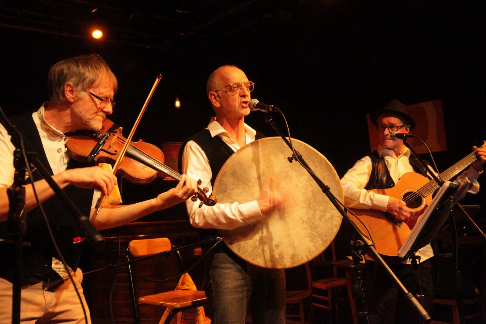 Am Sonntag gab es auch am Nachmittag ein Konzert. Schon seit den Achtzigern pflegt das Trio Schaukelperd aus Saargemünd, der direkt saaraufwärts gelegenen lothringischen (Quasi-)Nachbarstadt Saarbrückens, Lieder in Lothringer Mundart. Die Gruppe setzt sich zusammen aus Didier Atamaniuk (Geige, Tinwhistle, Gesang), Hervé Atamaniuk (Drehleier, Rahmentrommel, Tin Whistle, Gesang) und Michael Schäfer (Gitarre, Gesang – nicht der Fingerpicker vom Workshop). Nicht wenige ihrer Lieder stammen aus der Sammlung Verklingende Weisen von Pastor Luis Pinck, der sie in der Zeit zusammentrug, als Lothringen zu Deutschland gehörte. Die Lieder sind teils in Mundart, teils auf Standarddeutsch überliefert. Etwas neidisch würden man in Lothringen auf das Elsass und die Bretagne schauen, deren Regionalkulturen bekannter seien. „Armer Lothringer Bur“ („Armer Lothringer Bauer“) ist wohl das bekannteste der Lieder, die sie vortrugen, aber auch die „schwarze“ Kultur der Bergleute brachte Liedgut hervor. Es ging in ihren Beiträgen also oft um Armut, Arbeit und Selbstbehauptung, was sie aber mit viel Humor präsentierten.