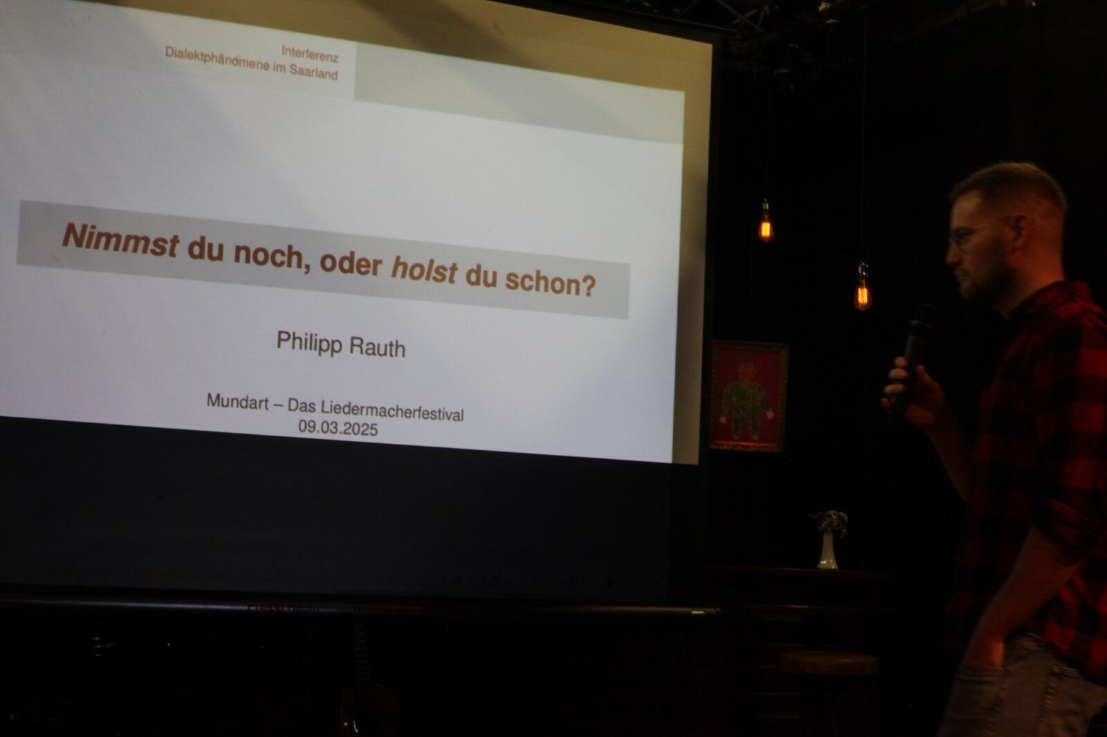 Einen Fachvortrag unter dem schönen Titel „Nimmst du noch oder holst du schon“ hielt am Sonntagnachmittag Philip Raut, Sprachwissenschaftler an der Universität Saarbrücken. Gemeint ist damit, dass man im Moselfränkischen und teilweise auch im Rheinfränkischen in der Regel „holen“ verwendet, wo im Standarddeutschen „nehmen“ gesagt wird. So ist man etwa froh, wenn man beim Blick auf die Waage „abgeholt“ hat, geht ins Tonstudio, um Lieder „aufzuholen“, oder „holt“ bei Kopfschmerzen eine Tablette. Ein anderes Spezifikum im Saarland ist, dass man Demonstrativpronomen an anderer Stelle in den Satz einbaut als man es aus dem Standarddeutschen kennt – zum Beispiel in dem Satz „die do leckere Roschdworschd“ („die leckere Bratwurst dort“). Rauts eigene „Orewälder“ (Odenwälder) Mundart, obwohl ebenfalls Rheinfränkisch, kennt diese Besonderheiten nicht.