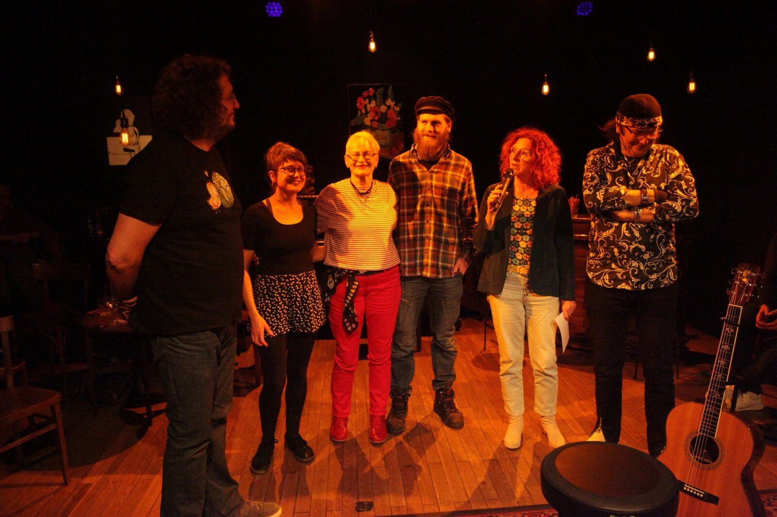 Zum Abschluss ein Gruppenfoto mit (v. l.) Manuel Sattler, Elena Seeger, Feli, Lennon von Seht, Susanne Wachs und Marcel Adam. Anwesend am Festival waren indes noch zwei wahre Meister der Bühnenfotografie, Zippo Zimmermann und Katrin Reis, deren Fotos man auf der Festivalwebsite sehen kann: www.mundartlieder.de/fotos. 2027 soll das zweite Mundartliederfestival in Saarbrücken stattfinden.