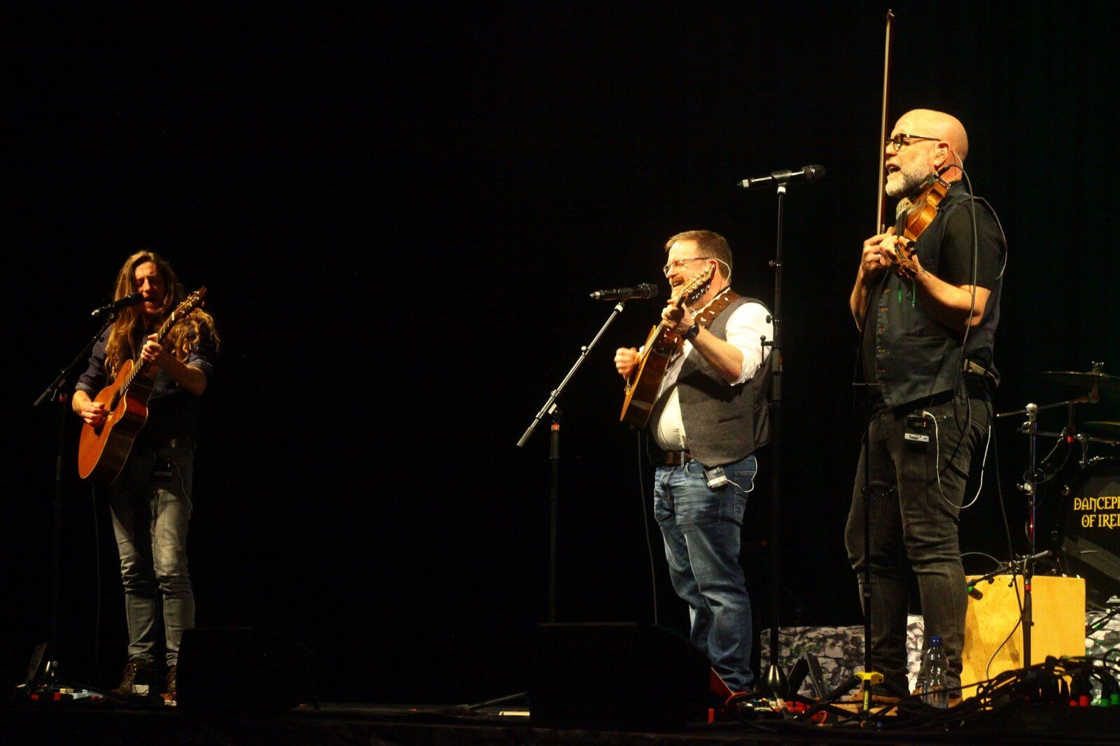 Drei Bands waren es wieder, die einander ablösend und am Schluss zusammenspielend den Abend bestritten. Den Anfang machten Cua aus dem irischen County Laois, bestehend aus John Davidson (Gesang, Geige), Shane Booth (Gesang, Gitarre) und Ros O’Meara (Gesang, Bouzouki, Gitarre), Letzterer übrigens aus Schottland. Ihre Musik überraschte durch viele Stile, die einander umschlangen und durchdrangen – von rustikalen Arbeitsliedern und Einlagen, die an Country erinnerten, über Songs, die von den Beatles hätten sein können bis zu einem bisweilen sehr schrägen, geradezu jazzigen Geigenspiel, das an Hölderlin Express erinnerte oder aber, wie im Stück „Black Dog“, an ungarische Musik. Vor allem aber war es der mehrstimmige Gesang aus kräftigen Männerkehlen, der wohl als Hauptmarkenzeichen gelten konnte. Allerdings scheinen die drei bisweilen sehr verliebt in den Refrain zu sein, sodass man etwas mehr Text vermissen mochte, zum Beispiel bei der häufigen Wiederholung von „lit my soul on the way to the fire“, was sich aber dennoch gut anhörte und zum Mitsingen animierte.